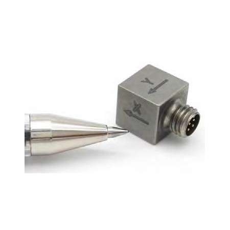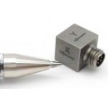 Accelerometro IEPE triassiale subminiatura, range +/-100g, banda passante 2Hz-15kHz, -50 +125°C operativi, montaggio adesivo o a vite M3x0,5, connettore laterale, massa 4,3 gr.