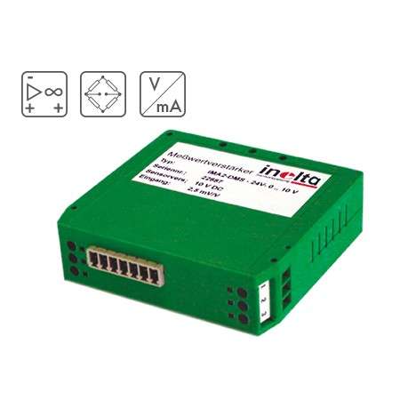 Condizionatore di segnale per celle di carico/ponti estensimetrici completi. Alimentazione 9…18 Vdc. Alimentazione al ponte 10Vdc. Sensibilità 1…2 mV/V. Uscite elettriche +/-5 V, +/-10V, 0-5V, 4-20mA. Montaggio Barra DIN